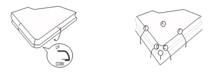 4. When applying the film, apply heat before pulling the film firmly around the corner as shown in the diagram (marked as A, C, D, E & F).